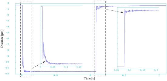 The step response to a desired 11 m displacement of the phase shifter. Data are captured by the external laser interferometer.
