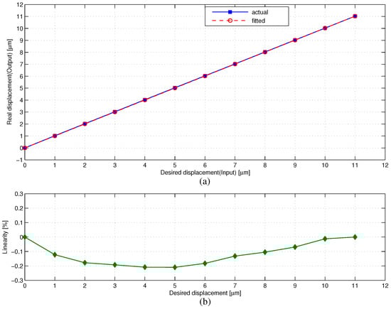 Linearity of the phase shifter: (a) displacement curve; (b) linearity error.