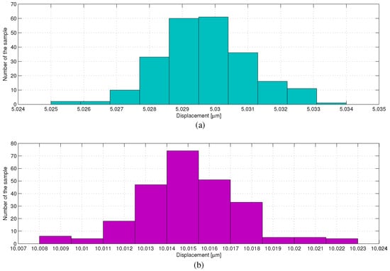 Repeatability of the phase shifter: (a) displacement distribution at 5 m ( = 2 nm); (b) displacement distribution at 10 m ( = 3 nm).