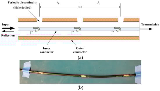 The structure of the coaxial cable Bragg grating (CCBG) sensor: (a) Depiction of the CCBG sensor’s working principle; (b) Depiction of the CCBG sensor’s real appearance.