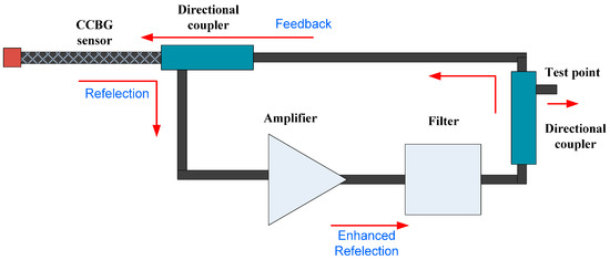 Using Equation (2) to obtain the strain applied, the resonant frequency shift should be obtained first. Also, the resonant frequency shift can be measured by a vector network analyzer (VNA). Although CCBGs can be joined together to build a distributed network, the VNA is considered too expensive for many applications. To solve this problem, a positive feedback system is introduced to enhance the sensitivity of the CCBG sensor [13]. The sensor’s Q factor is improved, making it possible to measure the strain applied on the CCBG sensor with a cheap spectrum analyzer (SA), rather than an expensive VNA.