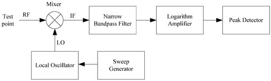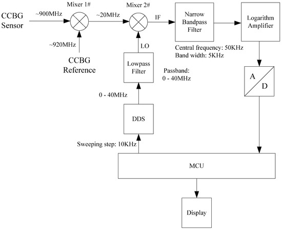 As shown in Figure 3, the spectrum analyzer consists of a sweep generator, local oscillator, mixer, narrow bandpass filter, logarithm amplifier and peak detector. The signal (radio-frequency, RF) from the test point of the CCBG sensor is mixed with the output of a local oscillator (LO) in the mixer. The mixer’s output is an intermediate-frequency (IF) signal, and its frequency can be described by the following: