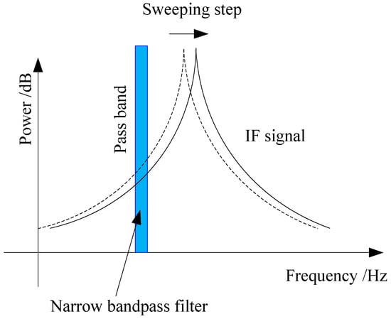 Then the RF signal is sent to the narrow bandpass filter for frequency selecting. After that, the filtered signal is sent to the logarithm amplifier. Through the logarithm amplifier the IF signal’s intensity in the narrow passband is converted into power. When the local oscillator is tuned by the sweep generator, by Equation (4) or Equation (5), the IF signal is also changed in the same way as the LO signal. The filter’s passband is narrow and fixed. In the frequency domain, the tuned IF signal passes through the passband of the narrow bandpass filter sequentially, which is illustrated by the sketch below.