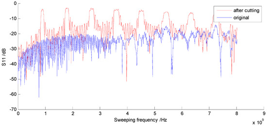 These are S11 data collected before and after cutting: the blue line is the original data before cutting; the red line is the new data after cutting.