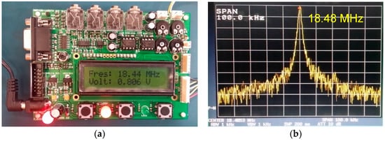 Shown in Figure 10, the peak frequency of 18.44 MHz obtained by the portable spectrum analyzer is close to the 18.48 MHz obtained by the spectrum analyzer R3272. Similar results were also achieved when some other stresses were applied, which are shown in Table 2. According to the test results, the portable spectrum analyzer could measure the IF signal’s peek frequency with high accuracy, with relative errors to the spectrum analyzer R3272 less than ±0.4%.