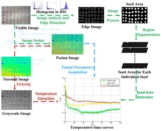 Image fusion technology was adopted to extract seed regions in the thermal images with the disk areas in the visible images. Then, the temperature data of each individual seed was obtained through multiplication of thermal images and visible images. The average over all pixels of the seed region was calculated as the resulting temperature value T and the value can be expressed as the follow equation (Equation (1)):