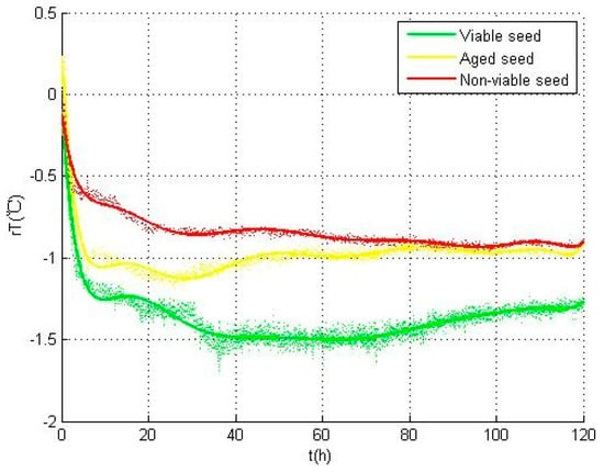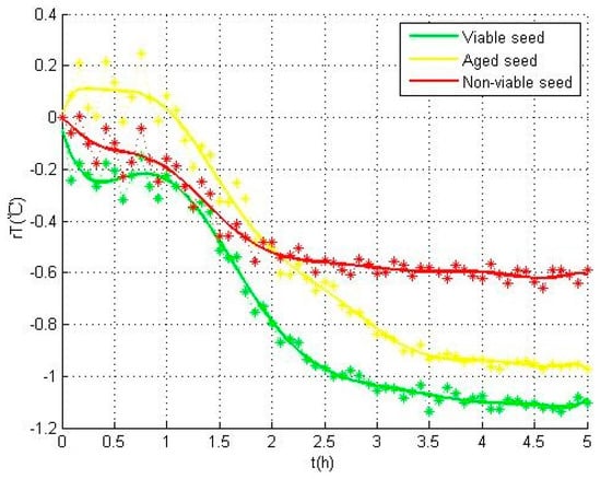 These differences in the temperature curves are mainly reflected in the imbibition period, and can be explained by the biophysical and biochemical changes occurring during the germination test. The imbibition period was affected by the membrane permeability. Compared with viable seeds, the membrane permeability of aged seeds was changed and water absorption in the water uptake period became slower, which resulted in the delay of sharp decline in aged seeds. For non-viable seeds, although the seeds lost the viability, they still had certain water absorbing capacity [22,26]. Considering that different categories of seeds have different characteristics in the internal metabolic activity, the seeds showed distinct differences in their performance. To be specific, the non-viable seeds had the fastest temperature rise in this process, the aged seeds followed, while the viable seeds had the slowest.