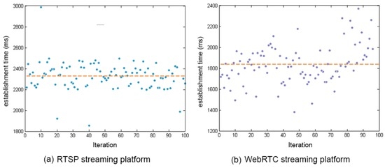 This subsection shows the analysis of the different measures taken on the connection establishment time and stream reception time obtained from the implementations of the two streaming protocols. The measurements were made using the system time that is implemented in Java programming language, and, therefore, in the Android platform, in the System class with the currentTimeMillis() function. This function returns the current time in milliseconds. In order to get the connection establishment time, we took the time at the moment when user A launched the streaming, and then the time again when the connection was fully established. Subtraction was then performed between them to obtain the connection establishment time. On the other hand, the stream reception time is the time between the correct communication establishment and the time when the first video packet is received.
