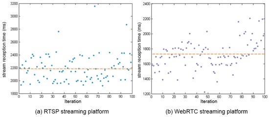 The comparison between both stream reception times can be seen in Figure 6, where a similar behaviour to the case of the connection establishment time is observed, with an average of 2.161 s for RTSP and an average of 1.709 for WebRTC. Adding the two differences, the total difference between the two protocols is almost one second to the WebRTC protocol. Moreover, we assume that the delay in the stream reception time could be repeated in other moments of the streaming, increasing the delay of the system.