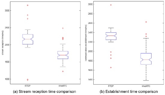 The difference between the two protocol times can be seen in Figure 7. A confidence interval of 95% has been used in all box plots. On the one hand, the first box plot in the figure shows the difference between the two protocols in the stream reception time. In this figure, a median of 2166 milliseconds, five outlier points and lower and upper limits of 1922 and 2445 milliseconds, respectively, for the RTSP streaming platform can be observed. On the other hand, the results for the Direct WebRTC streaming platform are a median of 1699 milliseconds, six outlier points and lower and upper limits of 1660 and 2026 milliseconds, respectively. The second box plot in the figure shows the difference between the two studied protocols in the communication establishment time. This figure shows a median of 2333 milliseconds, five outlier points and lower and upper limits of 2200 and 2498 milliseconds, respectively, for the RTSP streaming platform. In the other part of the plot, a median of 1822 milliseconds, three outlier points and lower and upper limits of 1380 and 2279 milliseconds, respectively, can be observed for the Direct WebRTC streaming platform. The use of these statistical values shows how the obtained measurements are grouped, which directly influences the QoS because if the measurement is not fairly grouped, the video streaming QoS could decrease, and indirectly influence the QoE in such a way that it could decrease too.