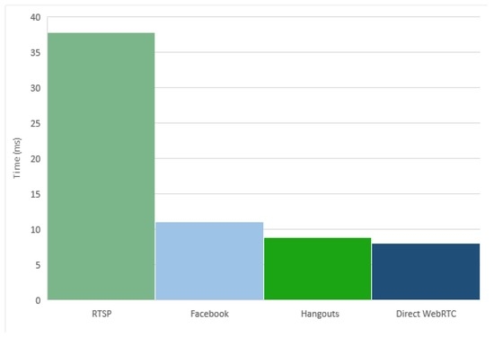 The average comparison among the five applications can be seen in Figure 9, where the Direct WebRTC streaming platform and the Google Duo applications show similar results due to their apparently similar implementations. They are followed closely by another Google application, the Hangouts application. Finally, Skype and Facebook applications have slower results.
