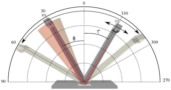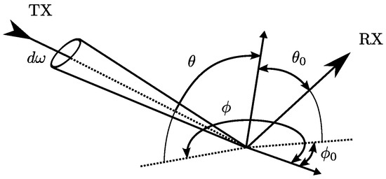 Therefore, according to the diagram shown in Figure 5, the reflected power on a surface material, , with a given angle of incidence wrt to the surface normal vector, reaching the detector at a given angle wrt the normal and angle wrt the maximum reflection ray (opposite to the incident ray), at a distance and with an effective detector area , will be the sum of the two components in the current model: