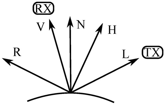 Empirical models: Figure 2 presents the vectors used in empirical models, where vectors L, V and R are the ray’s incidence, reception and maximum reflections (according to Snell’s law), respectively, and vector N is the vector normal to the surface.