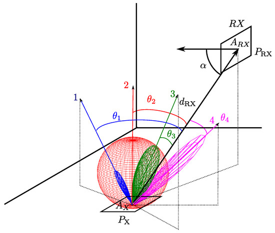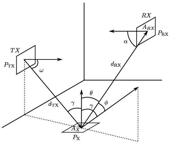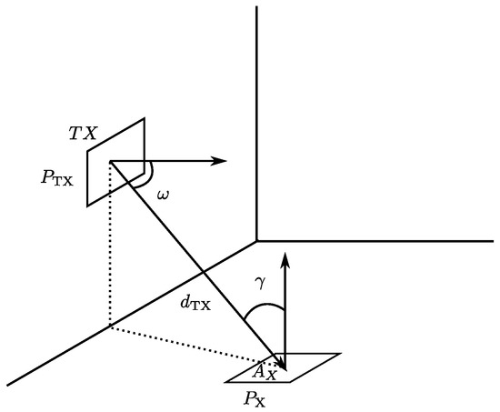 Thus, the received power in a similar setting as the one shown in Figure 5, located at a distance from the point x and with an angle wrt the surface vector x, would be given by Equation (6):