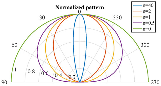 Figure 4 shows several normalized emission diagrams for an emitter with different values for its n index. Note that for , the behavior of the emission is isotropic, and the power emitted is distributed in all directions.