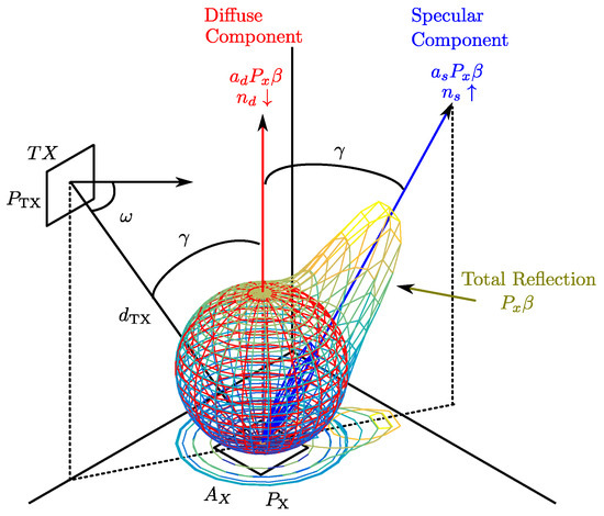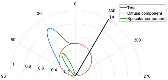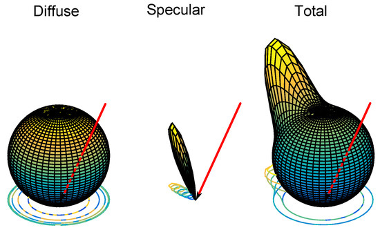 To facilitate understanding of the following descriptions, a reflection example with these two components is shown in Figure 9. The emitter is located at an angle . The diffuse component (in red) is oriented along the surface normal vector, in this case , with a wide emission diagram characterized by a low n index. The specular component (in green) is oriented along the angle (symmetric to the normal vector) and has a narrower emission diagram characterized with a high n index. The sum of both reflection components is shown in blue.