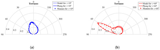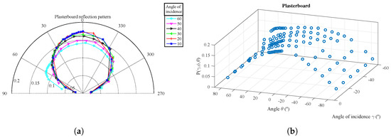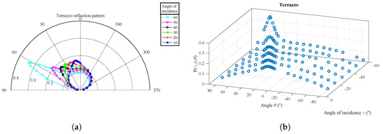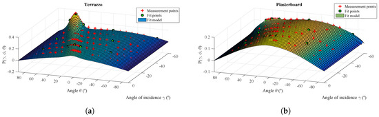 In this section, we present the results for the terrazzo and the plasterboard, as examples of one very specular material with two clearly distinct components and another material with a highly diffuse reflection behavior with one of the components (specular) almost canceled out. Figure 20 shows the reflection model adjusted as a function of the angle and . The adjustment procedure used the 12 power measurements obtained in the angles shown in Table 1. These measurements are shown in the figure as green circles. The data points shown as red crosses represent all of the data obtained from the experimental measurements; these were not used to calculate the model coefficients, but are shown here to compare the reflection model with the measured real values.