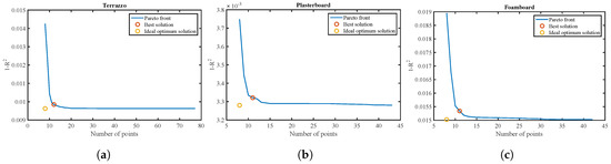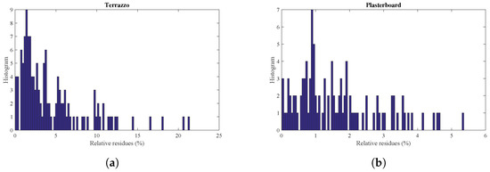 To illustrate the range of errors between the reflection model and the measured values, Figure 23 shows a histogram of the residues. In the case of the terrazzo, most of the residues are located below 8%, with some larger outliers that might be errors in the experimental data measurements. In the case of the plasterboard, the residues are lower, all below 5%.