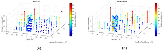 3D diagram of the normalized residues between model and experimental measurements. (a) Terrazzo; (b) plasterboard.