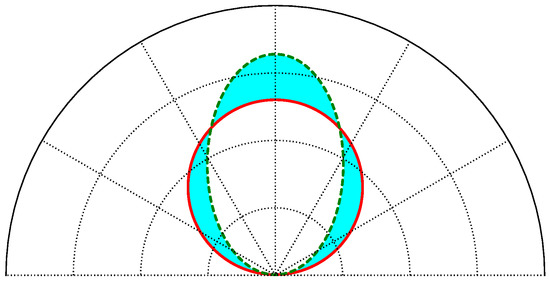 Figure 24 gives an example to illustrate how the error is calculated. The continuous red line represents the experimental measurements, while the discontinuous green line represents the function obtained with the reflection model. The error is calculated as the blue area divided by the area of the red circle.