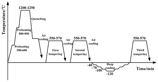 For supporting an approximate 7 t load, TH10 high-speed steel is used as the material of the middle knife and side knives after a special heat treatment process as shown in Figure 3. The special heat treatment process includes preheating two times at 500–600 ℃ and 800–850 ℃, respectively, quenching at 1200–1250 ℃, tempering three times at 550–570 ℃ and a deep cooling cycle down to –120 ℃ [7]. After machining the knives have maintained high hardness and high toughness under heavy load conditions [8].