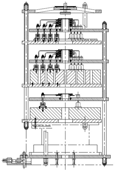 According to the measurement requirement of full range from 100 kg to 2000 kg in a limited space, a counterweight selection system is designed and produced. The counterweight selection system shown in Figure 7 consists of one stainless steel frame with three layer support, nested 1, 2, 2, 5 ratio counterweights from the inside to the outside and three sets of selection modules with nine motors for selecting the counterweights. The first selection module with four motors on the top of the counterweight selection system is used for selecting one weight or one set of weights among 10, 20, 20 and 50 kg options. The second one is similar as the first layer structure for selecting one weight or one set of weights among 100, 200, 200 and 500 kg options. There is one 1000 kg weight and one set of selection modules with one motor in the third layer.