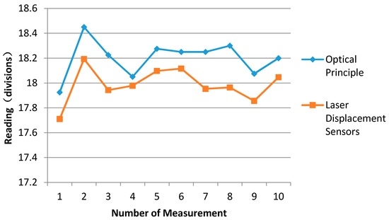After the indicator based on laser displacement sensors is adjusted, the reading comparisons between indicators based on optical principles and laser displacement sensors at 500 kg are shown as Table 4 and Figure 10. The comparison steps between indicators are as follows:
