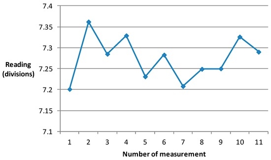 The results regarding the measurement of beam stability at 2000 kg are shown in Figure 11. The maximum value is 7.201 divisions, and the minimum value is 7.329 divisions. The difference between the maximum and minimum values is only 0.118 divisions.