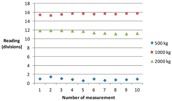 where is the uncertainty of error, is the repeatability of the mechanical balance corresponding to the applied load, is the no load sensitivity, is the applied load sensitivity, is the uncertainty deriving from the reference weight including the air buoyancy correction. The uncertainties of 500, 1000 and 2000 kg are shown in Table 5.