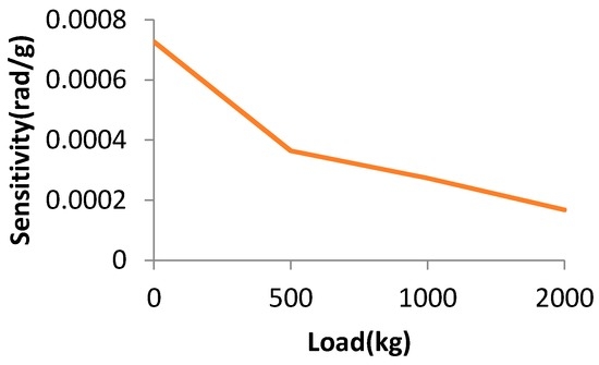 Figure 12 shows the results of 500, 1000 and 2000 kg. The sensitivity for 500 kg is more than 3.6 parts in 10−4 rad/g, the sensitivity for 1000 kg is more than 2.7 parts in 10−4 rad/g, and the sensitivity for 2000 kg is more than 1.7 parts in 10−4 rad/g. Figure 13 shows the relationship between the sensitivity and the load. As the load changes, the sensitivity becomes worse.
