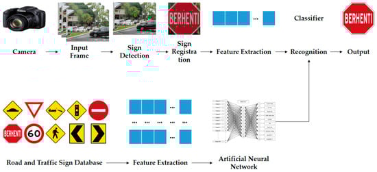 Various road sign detection and recognition methods and algorithms have been developed [19,20,21,22,23,24]. All researchers are implementing their methods to achieve a common goal [25]. Some researchers have done the detection [26,27,28] part, some are tracking the detection and a few have described effective recognition parts [29,30]. According to Paclík et al. [31], an automated traffic sign detection system was introduced for the first time in Japan in 1984. In the field of road sign recognition, the most common approach has two (2) main stages which are firstly detection and secondly recognition. The detection stage works to identify the proper region of interest (ROI) and color segmentation algorithms are mostly used. This detection stage is performed and followed by some form of shape detection and recognition. In the recognition stage, detected candidates are either rejected or identified with some recognition methods, for example, shape matching [32] and some other form of classifiers such as ANN [15], support vector machine (SVM) [7,33,34], clustering [35], and fuzzy logic [9].