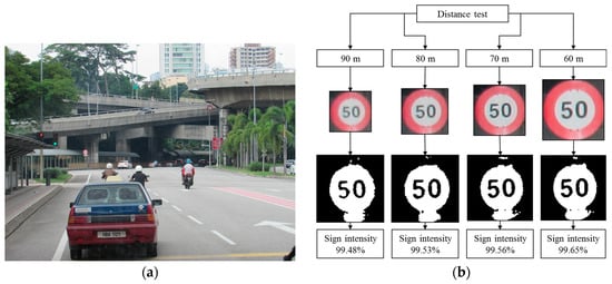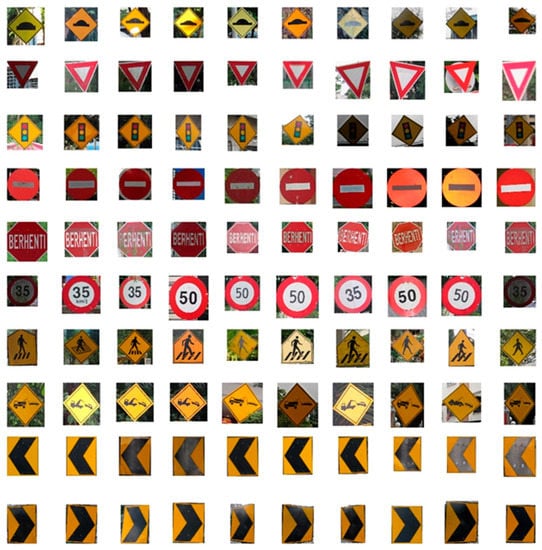 The sample images are collected from a reasonable quality onboard camera (Power Shot SX530 HS, Canon, Tokyo, Japan) which is placed inside a moving vehicle. Training images are collected by acquiring appropriate frames from video sequences captured on different roads and highways in Malaysia in a real-time environment from 8:00 a.m. to 6:00 p.m. As Malaysian cars drive on the left side of the road, the camera is placed on the left side of the dashboard to capture the traffic signs on the left side. A video frame segmentation algorithm is used to segment the video frame by frame with 1 second interval for further analysis. The aim of this is to create a real-time database of road sign images under different conditions which are summarized in Table 1.
