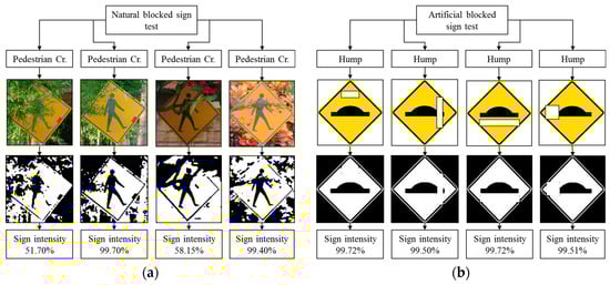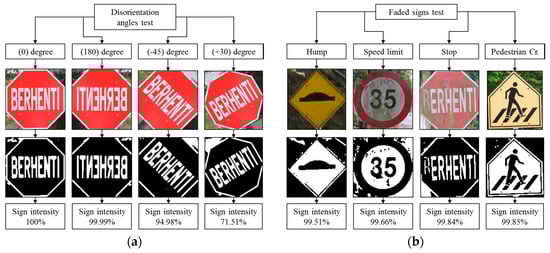 Robustness testing, (a) Disorientation angles test; (b) Faded signs test.