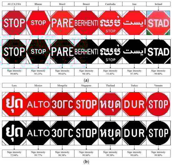 Robustness testing, (a) Seven set of different countries’ stop sign; (b) Seven sets of different countries’ stop signs.