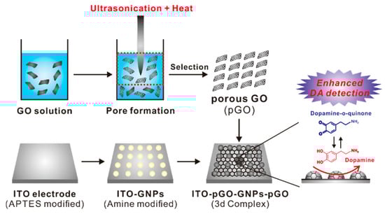 To this end, numerous attempts have been made to overcome the selectivity and sensitivity issues by functionalizing the surface of the electrodes or integrating other types of conductive materials. Graphene, composed of pure carbon molecules that are arranged in a two-dimensional (2D) honeycomb structure, has been widely applied for various research areas, such as batteries, display panels, solar cells, and even biomedical applications [,,,]; furthermore, the noticeable dopamine-detection performances of graphene derivatives have been reported [], and these are mostly owing to the π–π and electrostatic interactions between the surfaces of the graphene oxides (GOs) and the dopamine molecules []. Various grapheme-derivative-modified electrodes including graphene/glassy carbon electrode (GCE), graphene–gold nanoparticles/GCE, TiO2–graphene/GCE, and GO/GCE electrodes have been developed to enhance the performances of dopamine biosensors [,,]. However, porous graphene oxide (pGO), a type of grapheme-oxide sheet with copious hydroxyl groups and a porous surface [], was discovered and could enhance the electrostatic interaction between the pGO and the analytes, while also facilitating the electron transfer between the molecules and the underlying electrode substrates []. Despite its promises in a wide spectrum of applications, the use of pGO for biosensor applications, especially for the electrochemical detection of dopamine, has not been reported. A three-dimensional (3D) pGO/Gold nanoparticle-modified indium tin oxide (ITO) electrode that is effective for the electrochemical detection of dopamine is therefore reported here. The pGO was synthesized through harsh ultra-sonication and centrifugation, and was further embedded on the surface of both gold nanoparticles (GNPs) and ITO surfaces. Subsequently, the pGO structure and the pGO-GNP-pGO composites on the ITO electrodes were individually characterized, and this was followed by the testing and comparing of the dopamine-detection performance of each electrode. Thereafter, the ITO/pGO–GNP–pGO composite, which showed the best electrochemical redox signals in the presence of dopamine, was utilized to achieve linear correlations between the peak intensities and the dopamine concentrations. Lastly, the selectivity of the developed sensor toward dopamine detection was confirmed using ascorbic acid and dextrose as the interfering molecules.