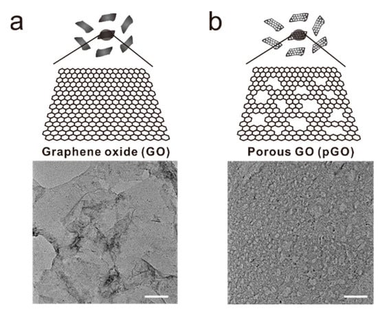 Schematic diagram and transmission electron microscopic images of (a) normal graphene oxide sheet and (b) porous graphene oxide sheet. Scale bar = 100 nm.