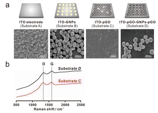 Field emission scanning electron microscopic (FE-SEM) images of the four different substrates: (a) bare ITO electrode (Substrate A), gold nanoparticle (GNP)-modified ITO electrode (Substrate B), pGO-modified ITO electrode (Substrate C), and ITO-pGO-GNP-pGO 3D structure (Substrate D); (b) Raman spectroscopy of Substrate C and Substrate D, showing the clear D (1350 cm−1) and G (1580 cm−1) bands of the pGO material.