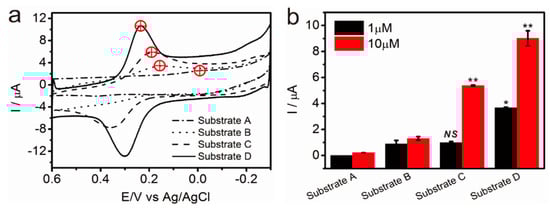 (a) Cyclic voltammetry (CV) curves of Substrate A, Substrate B, Substrate C, and Substrate D in the presence of 10 μM of dopamine for which DPBS (pH 7.4) was used as the electrolyte. The red marks represent the reduction potential (vs. Ag/AgCl) that appeared on the voltammogram; (b) The peak current intensities of each substrate in the presence of 1 μM or 10 μM of dopamine. (n = 3, unpaired student’s t-test, * p < 0.05, control group: Substrate B with 1 μM of dopamine, ** p < 0.01, control group: Substrate B with 10 μM of dopamine).
