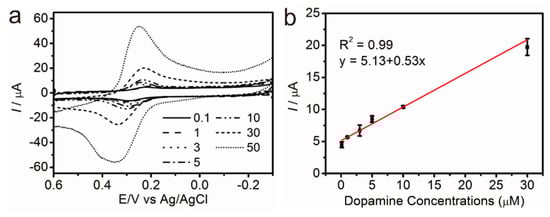 Remarkably, even the 0.1 μM of dopamine showed weak redox peaks that were distinguishable with the control group (DPBS without dopamine). The reduction and oxidation peaks on the cyclic voltammogram clearly increased with increasing the dopamine concentrations from 0.1 μM to 50 μM, as shown in Figure 5a. The reduction peak (Epc) is approximately 240 mV ± 10 mV with the dopamine-concentration changes (0.1 μM to 50 μM), proving the signal stability of the developed pGO-based composite for the dopamine detection. The LOD of the developed sensor was calculated as 1.28 μM with the linear range of 0.1 μM to 30 μM, which is superior to or similar to the previously reported sensing platform (Table 1).