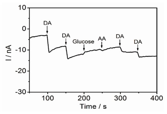 Since dopamine generally co-exists with the other molecules in the blood plasma including the AA, UA, glucose, and protein, it is important to confirm the selectivity of the developed electrode toward dopamine detection. As an interfering molecule, AA and glucose were chosen for amperometric dopamine detection. As shown in Figure 6, the addition of the dopamine (10 μM) showed significant changes in the current (8.1 nA and 6.0 nA), while the addition of the same concentrations of the AA and the glucose, respectively, did not result in any remarkable signal changes. The signal changes induced by the addition of the DA appeared on the voltammogram, indicating that the developed sensor is excellent in terms of the selectivity toward the dopamine detection. These findings can be used to conclude that the developed platform, the 3D pGO-GNP-pGO composite-modified ITO electrode, is effective for the electrochemical detection of dopamine, one of the most important neurotransmitters, in terms of both sensitivity and selectivity.