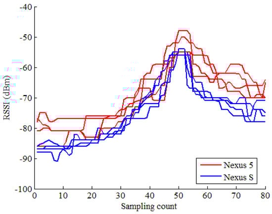 Crowdsourcing is the most promising solution for solving the site survey problem. This is due to the rise of the smartphone users and every smartphone user may become a potential contributor. By the built-in sensors of the smartphone, the inertial data and WiFi RSS data can be collected. Inertial data can be used to obtain relative trajectory of the user. Based on the relative trajectory, some methods are used to infer the location of each step and label the RSS vectors with the location information. Crowdsourcing is a low-cost and efficient way to extract useful information from data acquired by crowd participants. The crowdsourcing method has been successfully applied to different indoor maps and WiFi radio map construction systems [,]. For crowdsourcing-based radio map construction, the RSS variance problem is especially serious. The participant’s smartphones are usually different; additionally, the RSS vectors are collected at different times and in different environments.