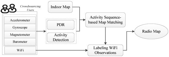 RCILS is a crowdsourcing-based indoor localization system, which utilizes built-in sensors of a smartphone to collect motion data, WiFi fingerprints and air pressure. The motion data includes acceleration, heading and angular velocity. The WiFi fingerprint includes the Medium Access Control (MAC) of the AP and the corresponding Received Signal Strength (RSS) value. The system overview of the proposed radio map construction method is shown in Figure 2.