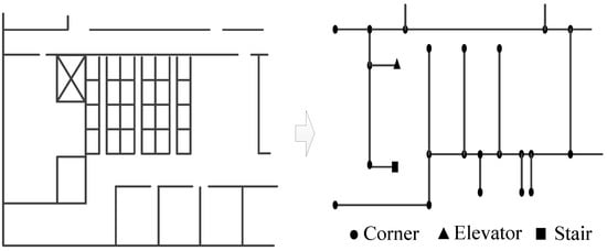 For activity sequence-based map matching, the indoor map should be converted to semantic graph, in which pathways are the edges and the intersections of the pathways are the vertexes, as shown in Figure 3. Based on the semantic graph, the location of the vertexes and displacement between each vertexes can be estimated. Moreover, the vertex also contains semantic information, which is used to match activities to the map. Figure 3 is an example of a semantic graph of the indoor map. The semantic information of the vertexes includes labelling as corner, elevator and stair.