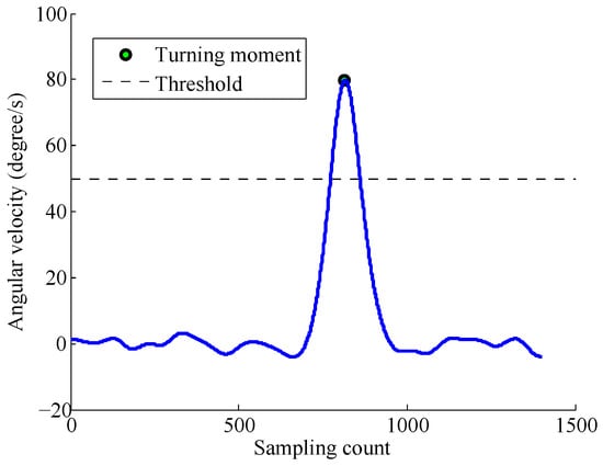 In an indoor environment, there are usually three types of activities: turning, taking the elevator, and walking stairs. Turning is the most common activity during the walking process. When a pedestrian turns, the angular velocity would generate a peak waveform, as shown in Figure 4 []. A turn is detected using the peak detection algorithm, which is used to find the local maximum or minimum during a period of time []. To eliminate the influence of the noise, a Butterworth filter of order 4 is used, with a cutoff frequency of 10 Hz.