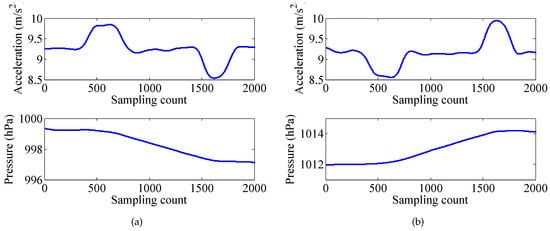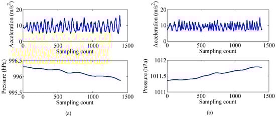 Generally, when the elevator rises, there will be an overweight state and a subsequent weightless state. On the contrary, when the elevator descends, there will be a weightless state and a subsequent overweight state. Moreover, the air pressure detected by the barometer can also be used for elevator detection, since the air pressure changes with the change of the altitude. The acceleration and pressure of the elevator activity are shown in Figure 5. Another activity with pressure change is walking stairs. Differently from using an elevator, during walking stairs, there is neither an overweight state nor a weightless state. The acceleration and pressure of the walking stairs are shown in Figure 6.
