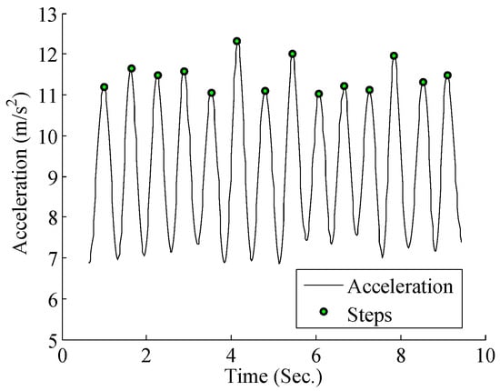 The second step of trajectory pre-processing is to estimate the relative displacement between each activity. The distance estimation is implemented by PDR. PDR is a pedestrian localization scheme that estimates the relative displacement by step detection and heading estimation. Step detection is realized by the peak detection algorithm, as shown in Figure 7. When a step is detected, the location is updated by the following equation: