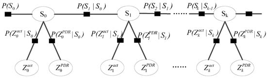 We use Hidden Markov Model (HMM) to match the activity sequence to the semantic graph of the indoor map. The activity sequence-based map matching method is shown in Figure 9. are the hidden state, namely the nodes of the semantic graph. is the transition probability from state to . The transition is assumed to be uniform over all neighbors of a given node. The observations of the HMM are activity detection results and displacement inferred by PDR, represented by and . The subscript k means the observations are obtained at state . and are, respectively, the observation probabilities of and . describes the probability of correct activity detection for a given hidden state, namely the confusion matrix. According to the principle of PDR, is made up two parts: distance observation probability distribution and heading observation probability distribution. Here, these two probability distributions are assumed to be Gaussian distributions [,]. Since distance and heading are independent, the observation probability distributions is defined as