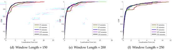 Given the fixed data amount (data amount is set to 45 min), Figure 12 shows the CDF of localization error in different lengths of sliding windows. It can be seen that, with the increase of the length of the sliding window, the localization error decreases. When the length increases from 20 to 250, the 80 percentile of localization error decreases from 23 m to 1.3 m.