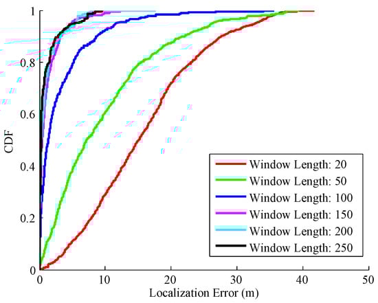 The CDF of localization error with different lengths of sliding windows (the data amount is 45 min).