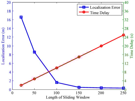 The mean localization error and time delay with different lengths of sliding windows is shown in Figure 13. From Figure 13, we can see that with the increase of lengths of sliding windows, the localization error decreases. However, the long length of sliding window means a long time delay of the localization system. As it can be seen from Figure 13, when the length is 20 samples, the time delay is 1.9 s, and when the length increases to 250 samples, the time delay is 25 s.